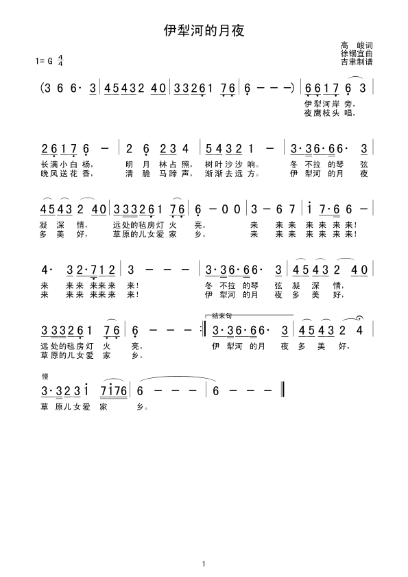 伊犁河的月夜 简谱 曲谱 歌谱