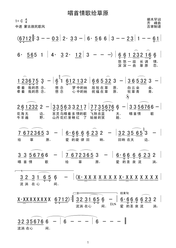 唱首情歌给草原 简谱 曲谱 歌谱