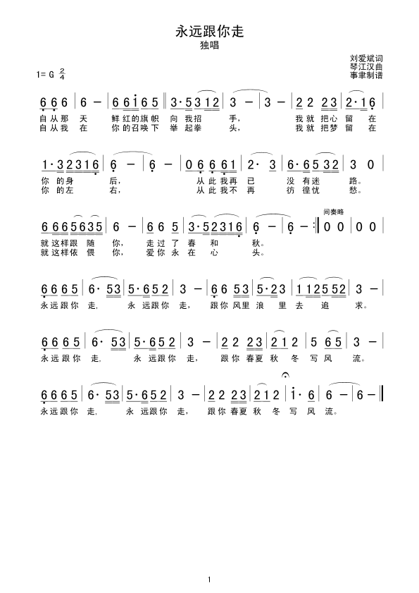 永远跟你走 简谱 曲谱 歌谱