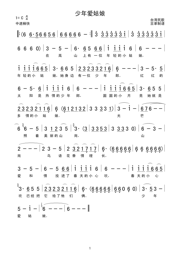 少年爱姑娘 简谱 曲谱 歌谱
