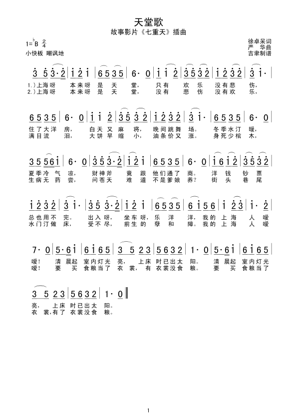 天堂歌 简谱 曲谱 歌谱