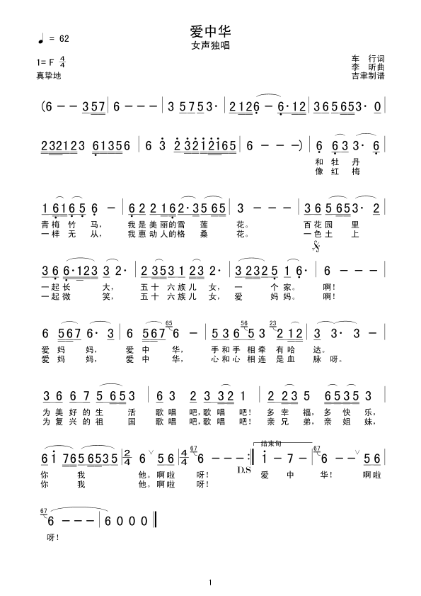 爱中华 简谱 曲谱 歌谱