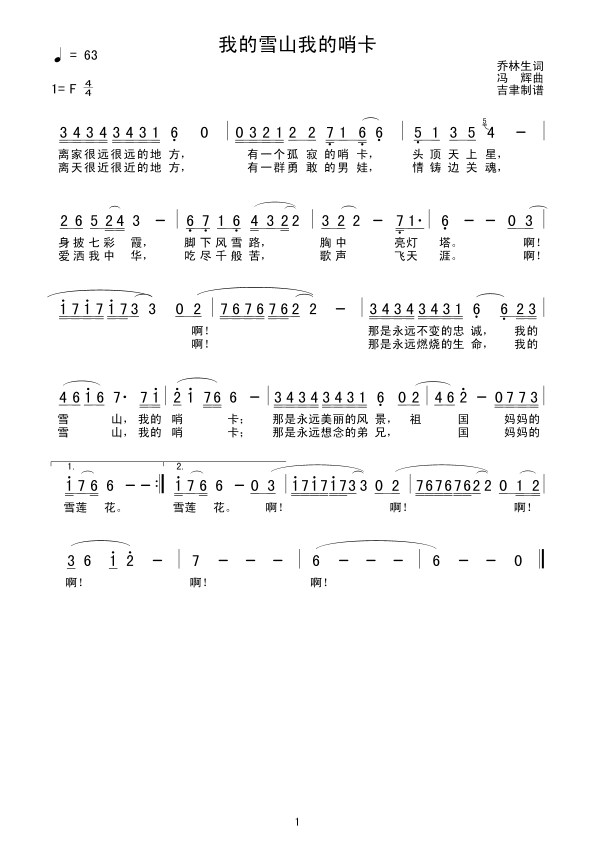 我的雪山我的哨卡 简谱 曲谱 歌谱
