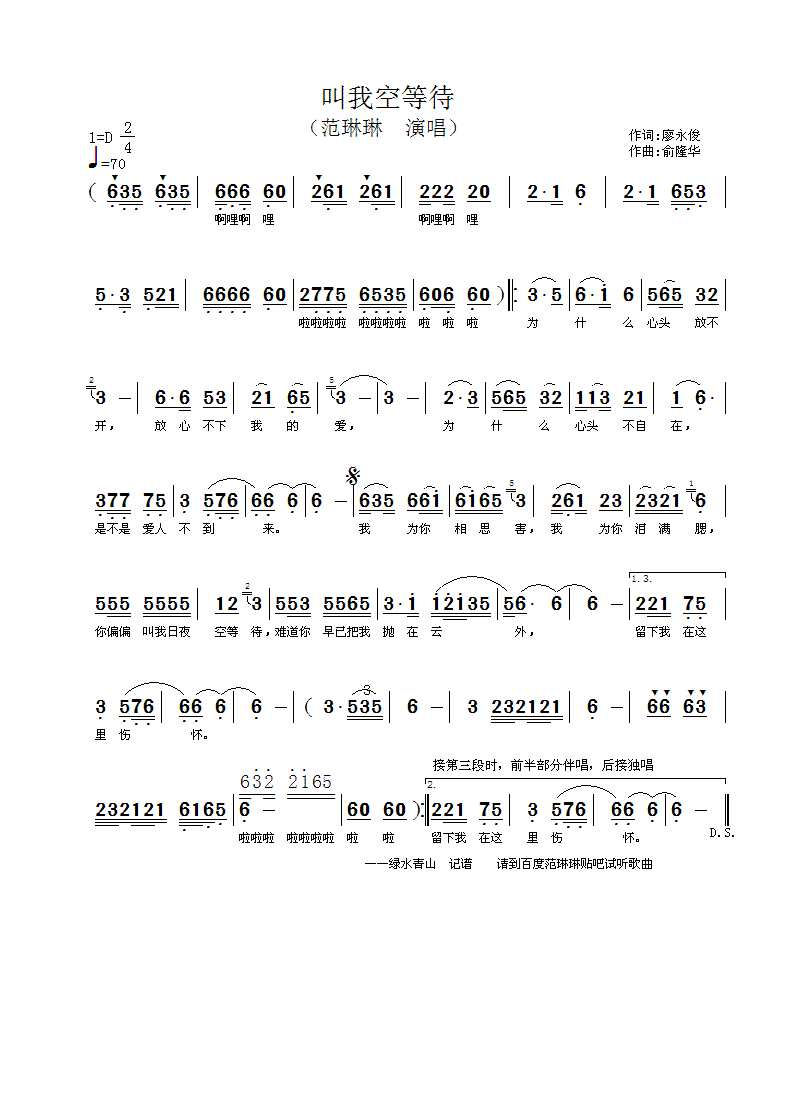 叫我空等待 简谱
