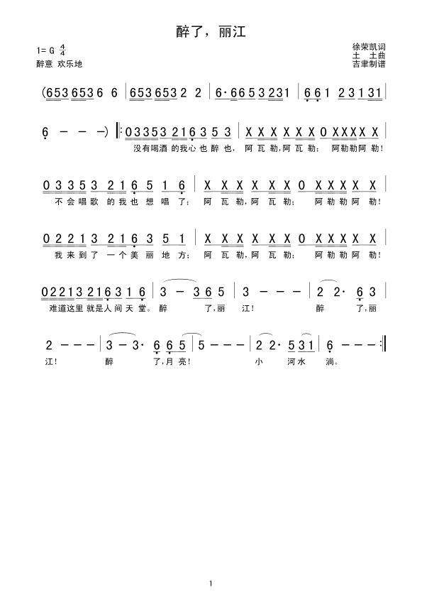 醉了,丽江 简谱 曲谱 歌谱