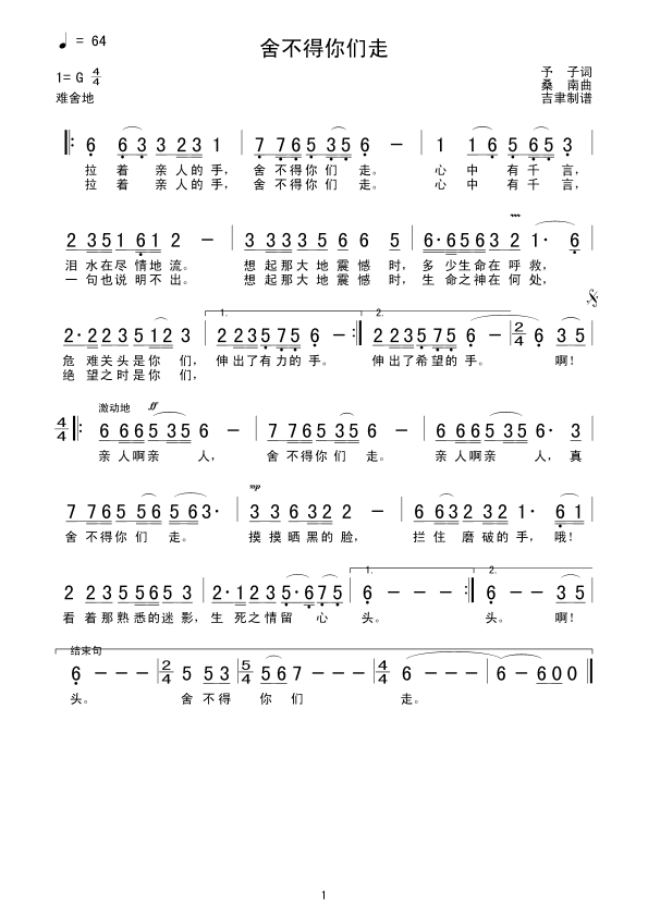 舍不得你们走 简谱 曲谱 歌谱