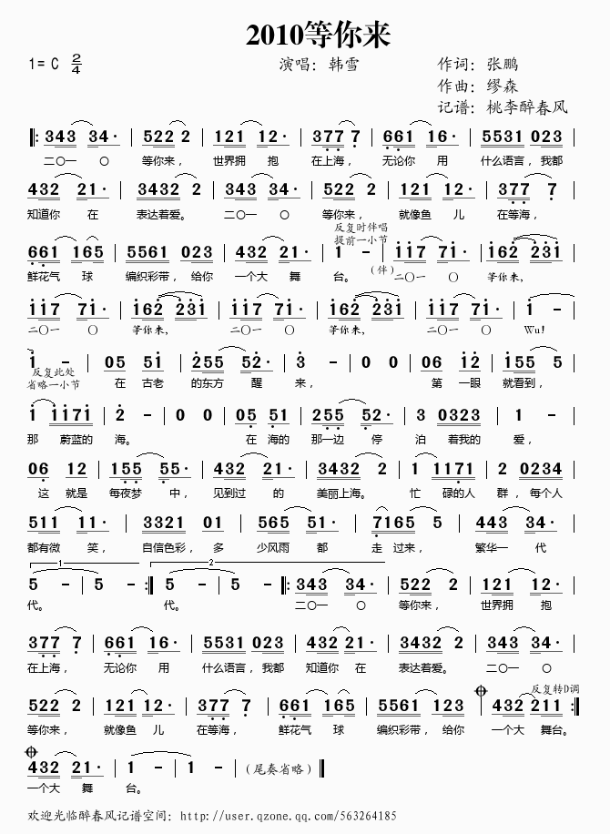 2010等你来 简谱 歌词