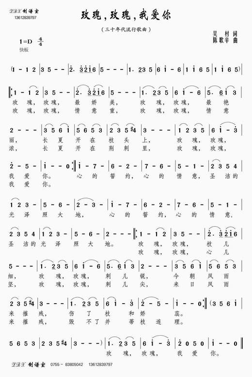 玫瑰玫瑰我爱你 五线谱 曲谱 歌谱