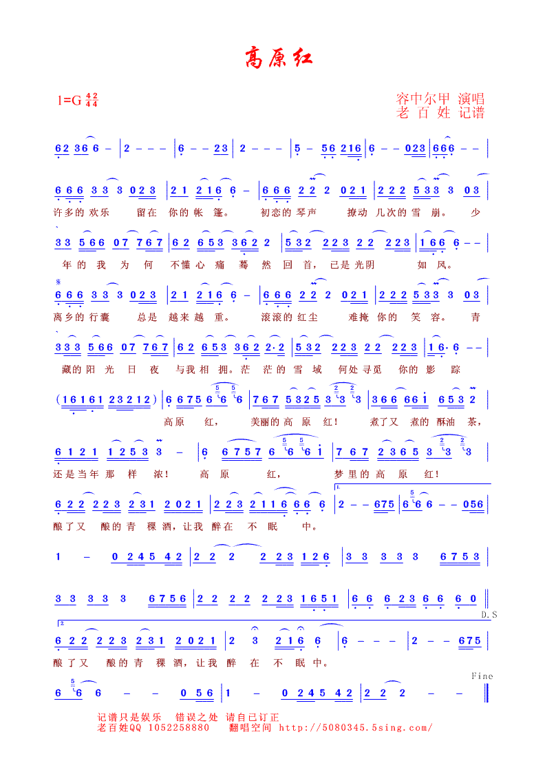 高原红 简谱 曲谱 歌谱