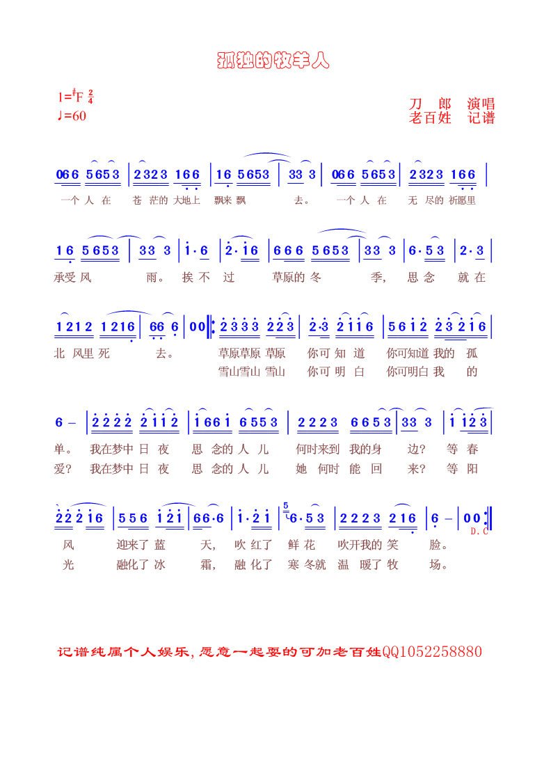 孤独的牧羊人 简谱 曲谱 歌谱