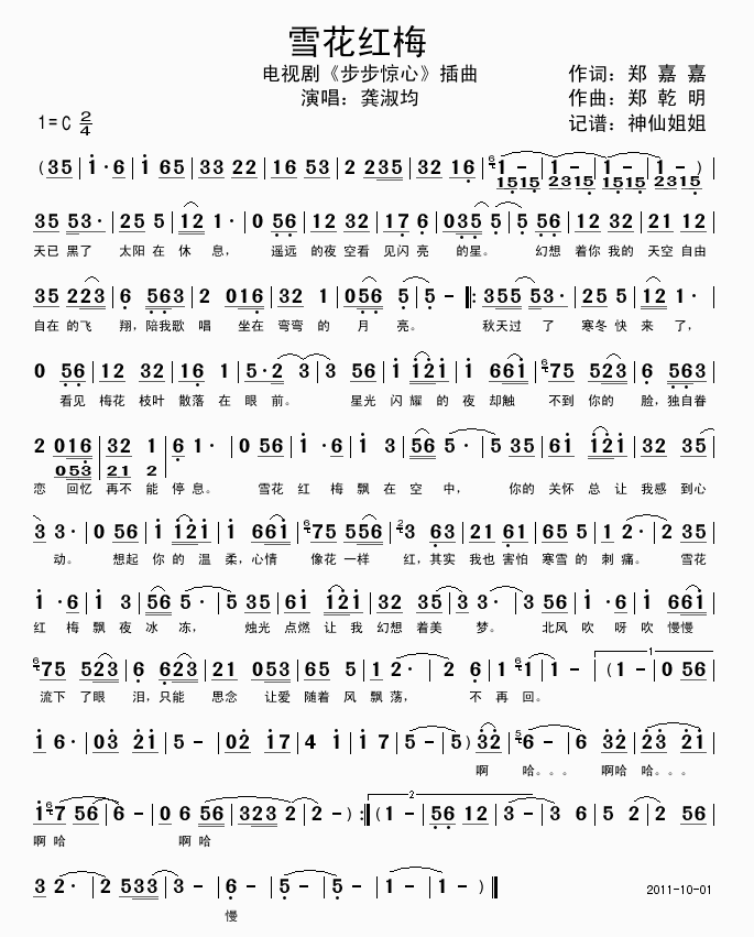雪花红梅 简谱 曲谱 歌谱
