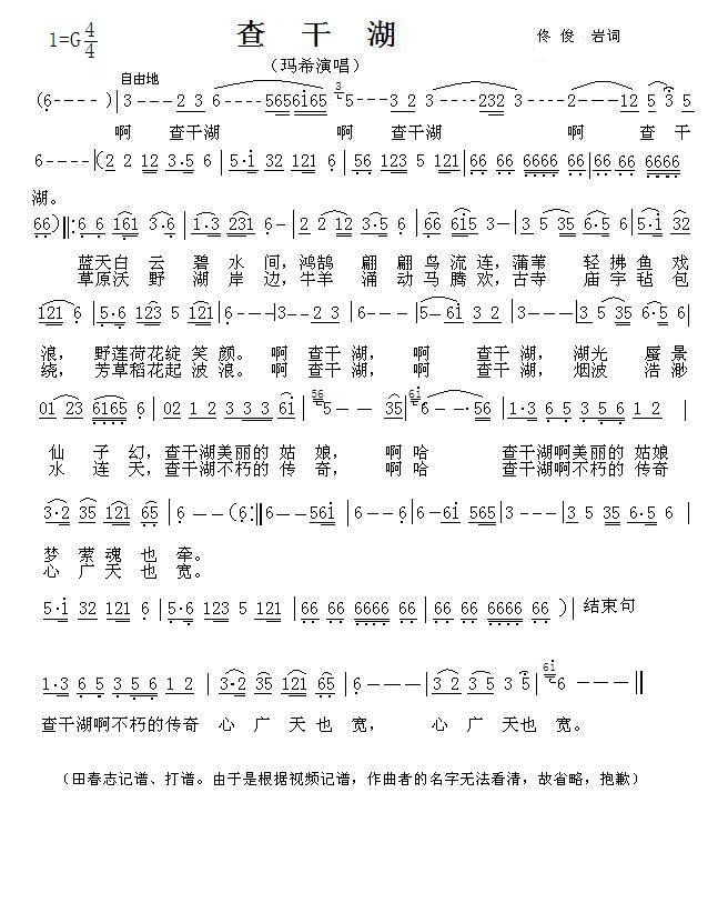 查干湖 简谱 曲谱 歌谱