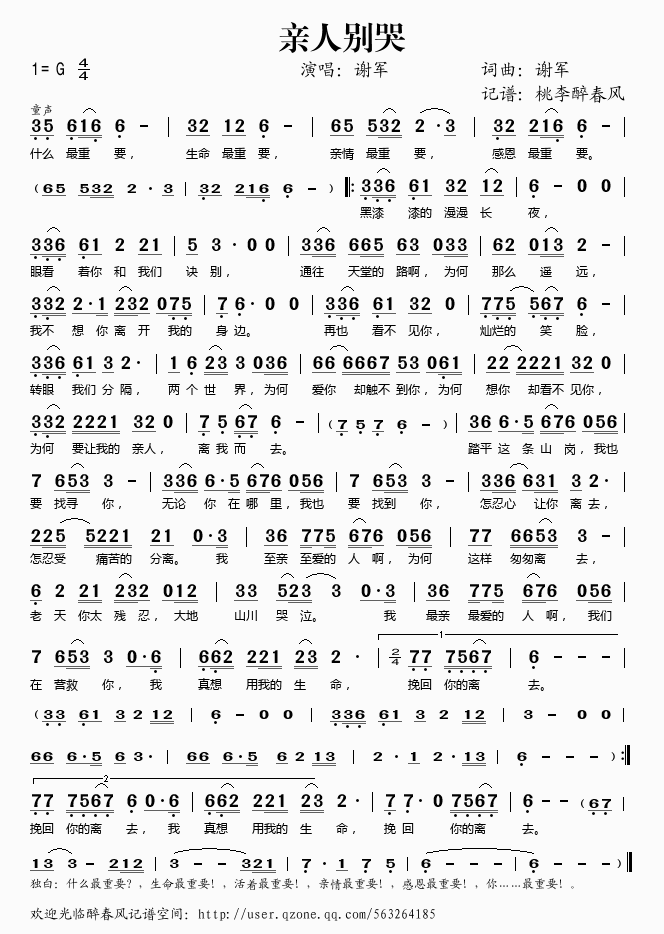 亲人别哭 简谱 歌词