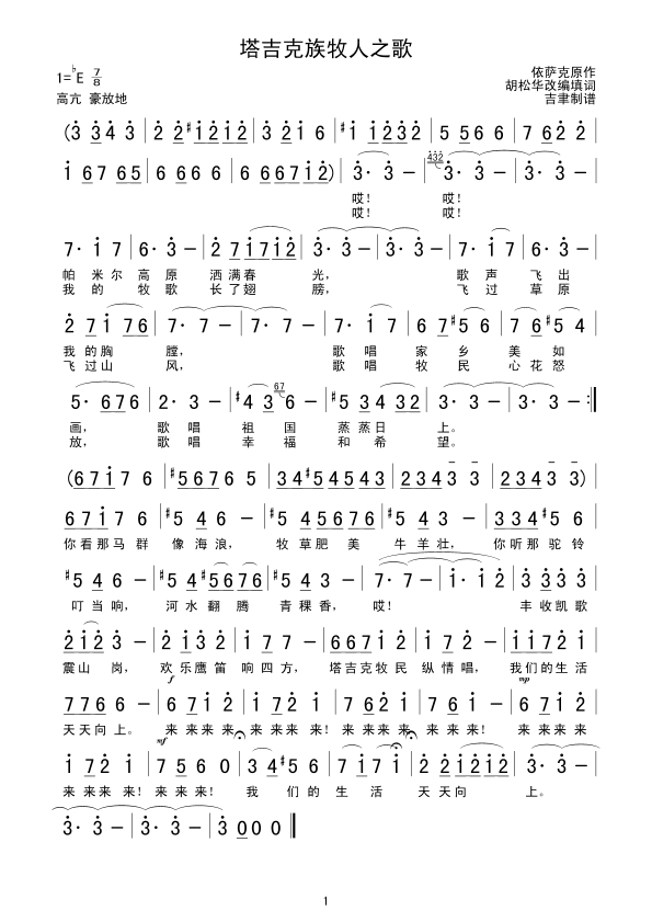 塔吉克族牧人之歌 简谱 曲谱 歌谱