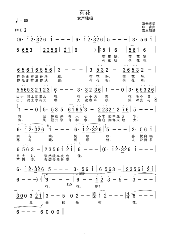 荷花 简谱 曲谱 歌谱