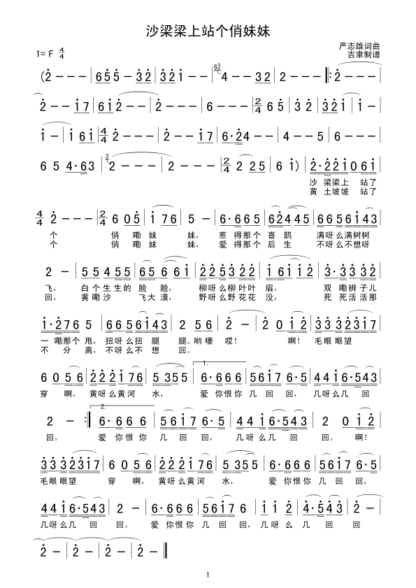 沙梁梁上站个俏妹妹 简谱 曲谱 歌谱