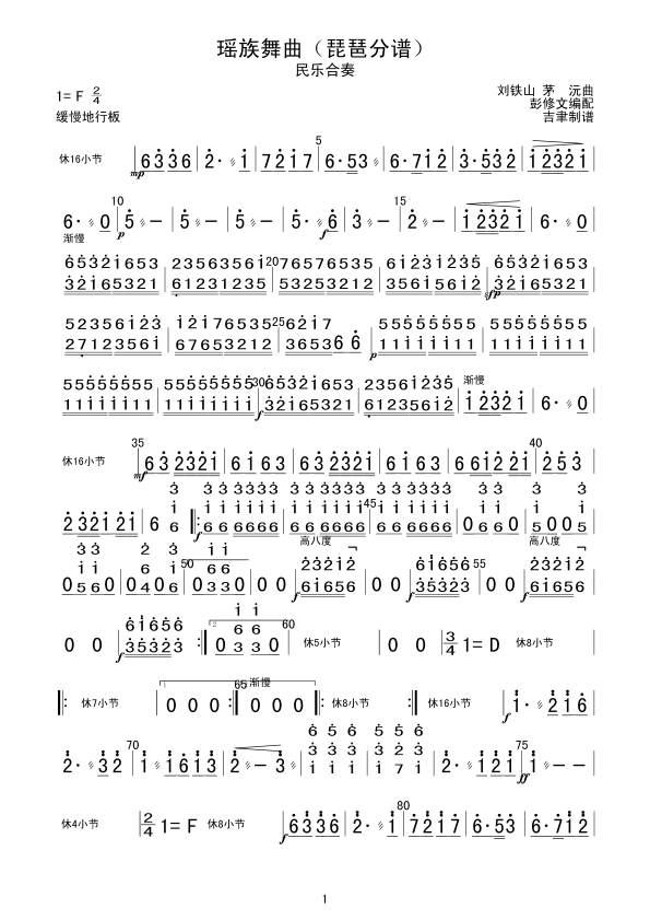 瑶族舞曲(琵琶分谱)简谱 曲谱
