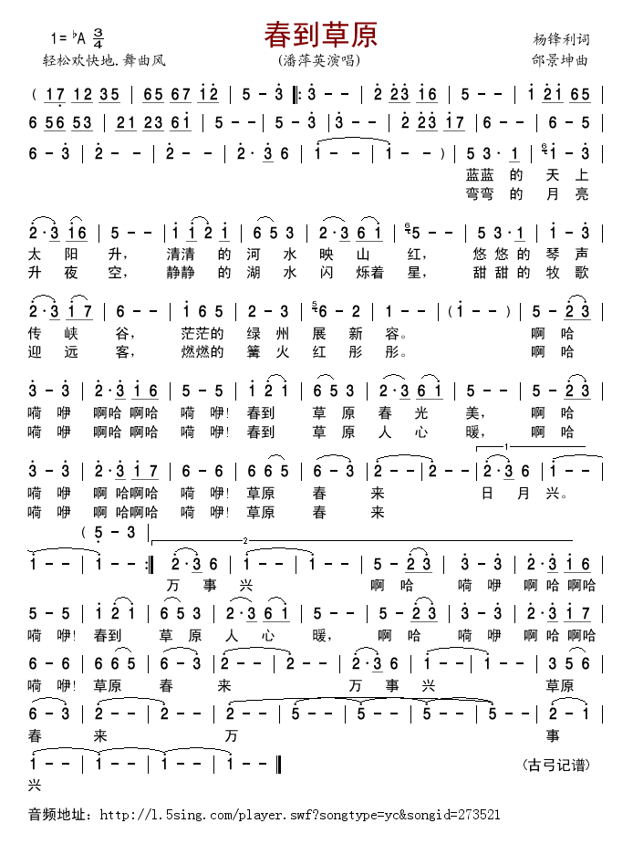 春到草原 简谱 曲谱 歌谱