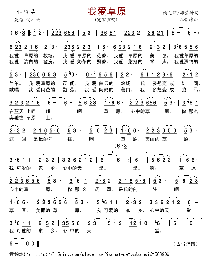 我爱草原 简谱 曲谱 歌谱