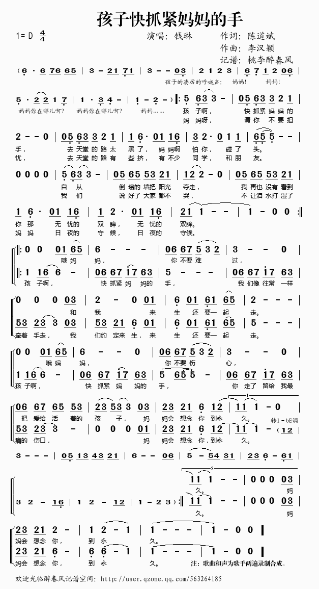 孩子快抓紧妈妈的手 简谱 歌词