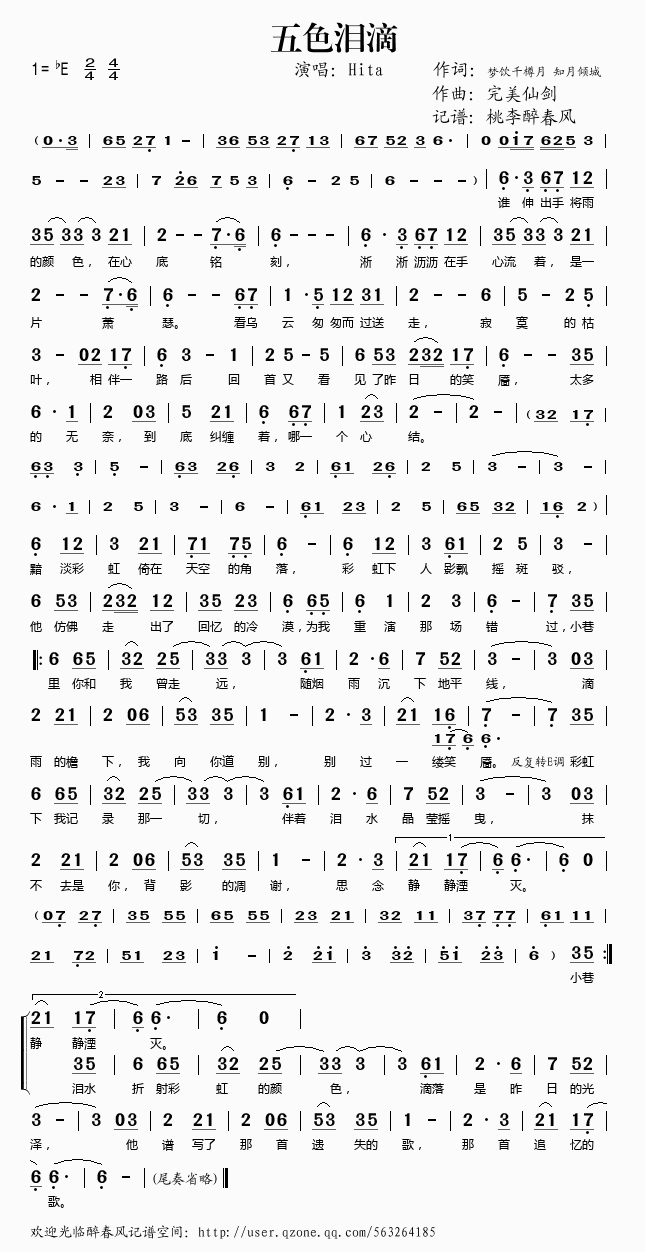五色泪滴 简谱 歌词