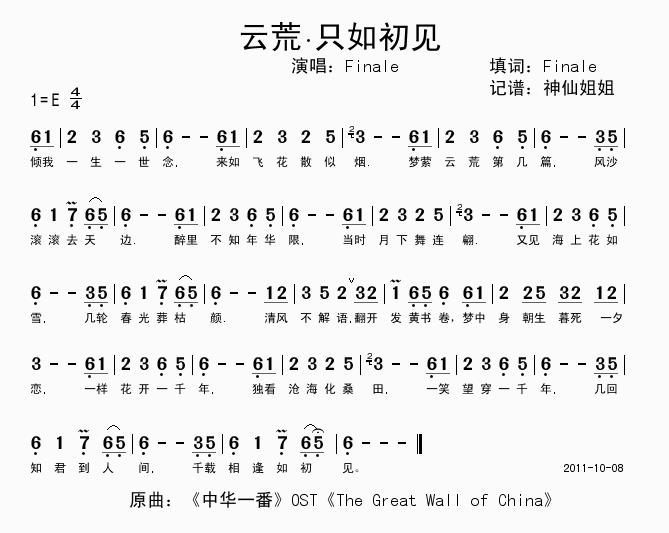 云荒.只如初见 简谱 曲谱 歌谱