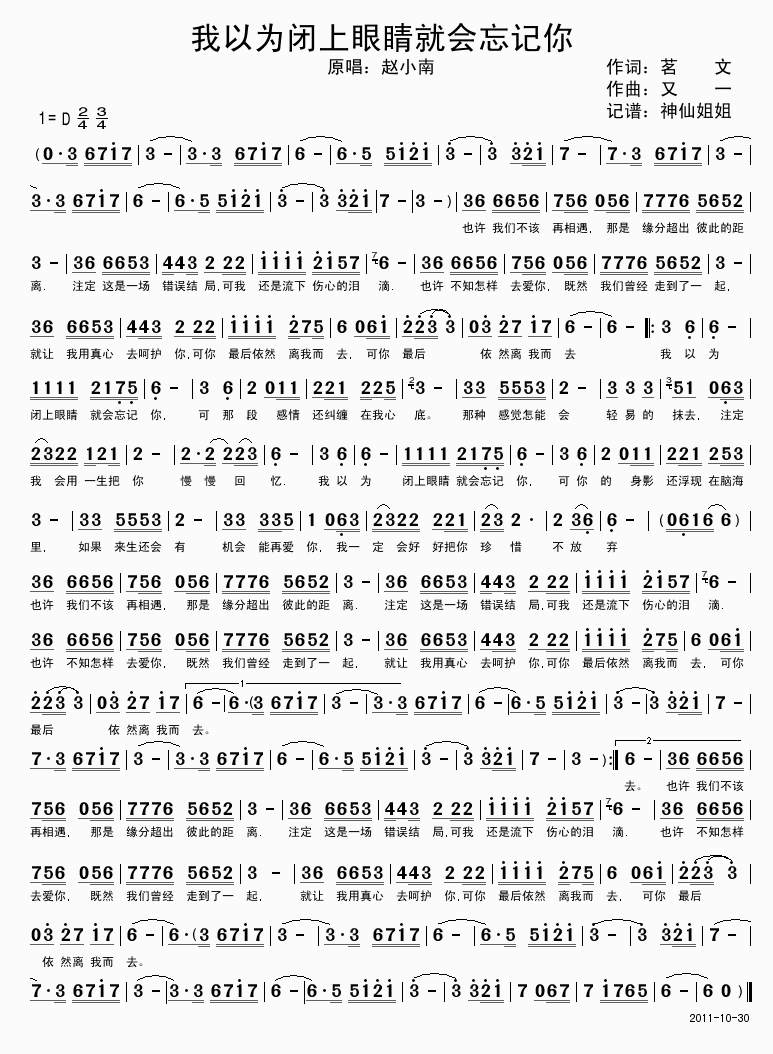 我以为闭上眼睛就会忘记你 简谱 曲谱 歌谱