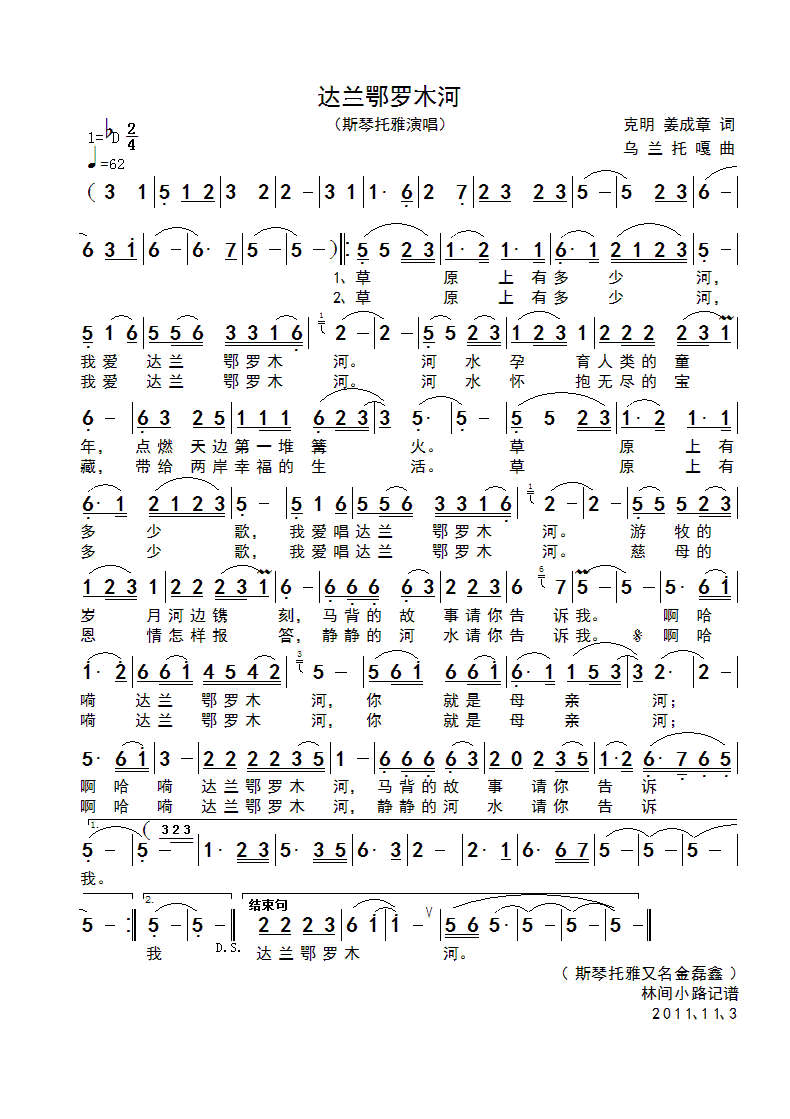 达兰鄂罗木河 简谱 曲谱 歌谱