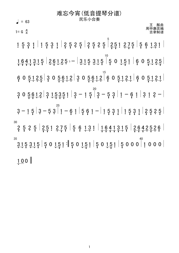 难忘今宵(柳琴分谱) 简谱 曲谱 歌谱