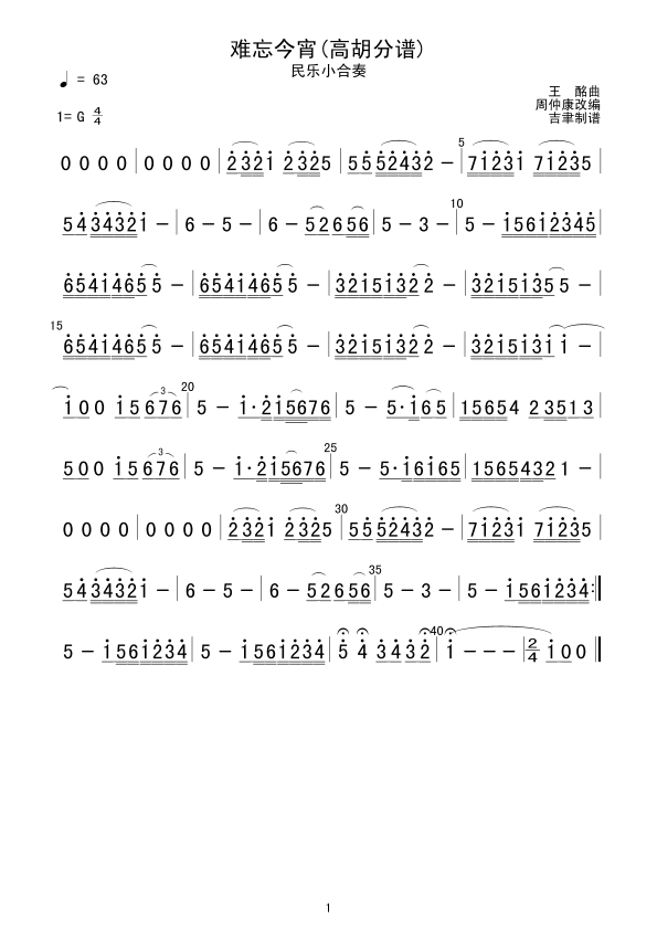难忘今宵(高胡分谱) 简谱 曲谱 歌谱