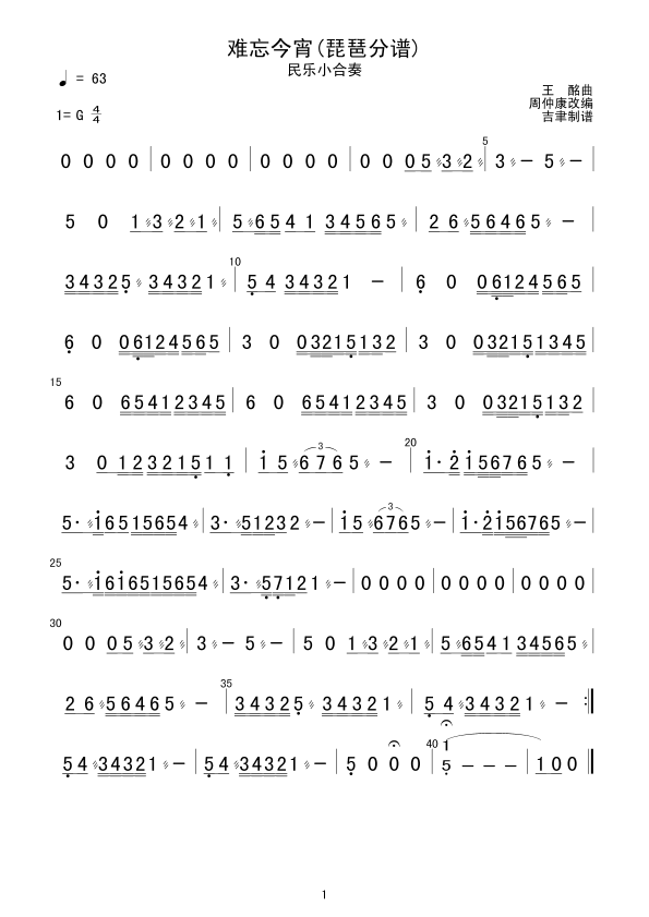 难忘今宵(琵琶分谱) 简谱 曲谱 歌谱