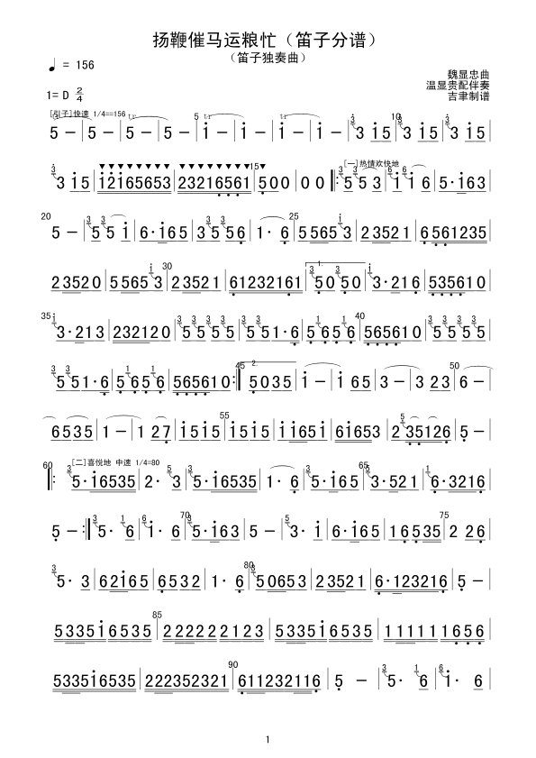 扬鞭催马运粮忙(笛子分谱) 简谱 曲谱