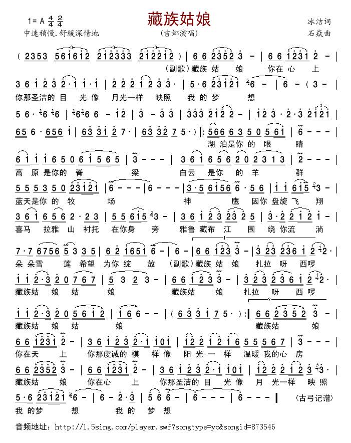 藏族姑娘 简谱 曲谱
