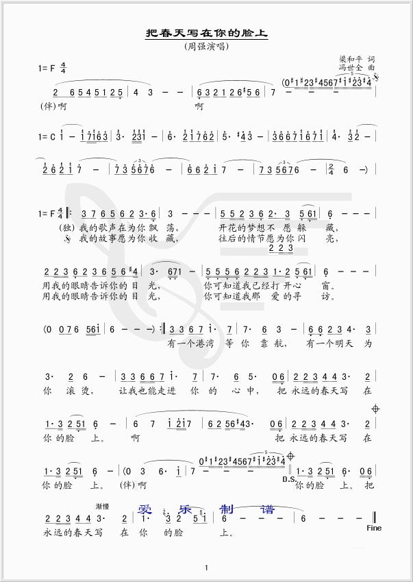 把春天写在你的脸上 简谱 曲谱 歌谱
