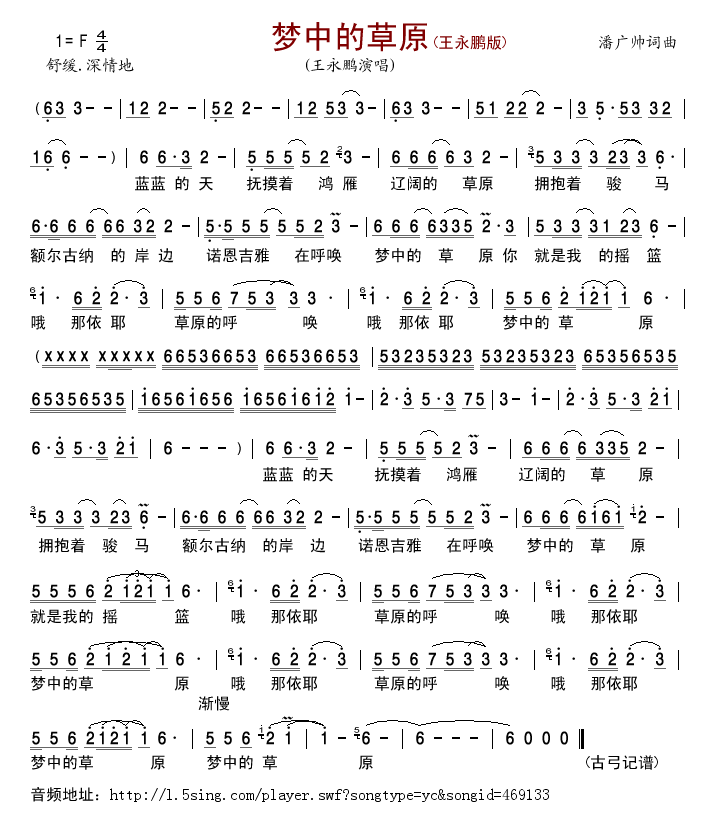 梦中的草原 (王永鹏版) 简谱 曲谱 歌谱
