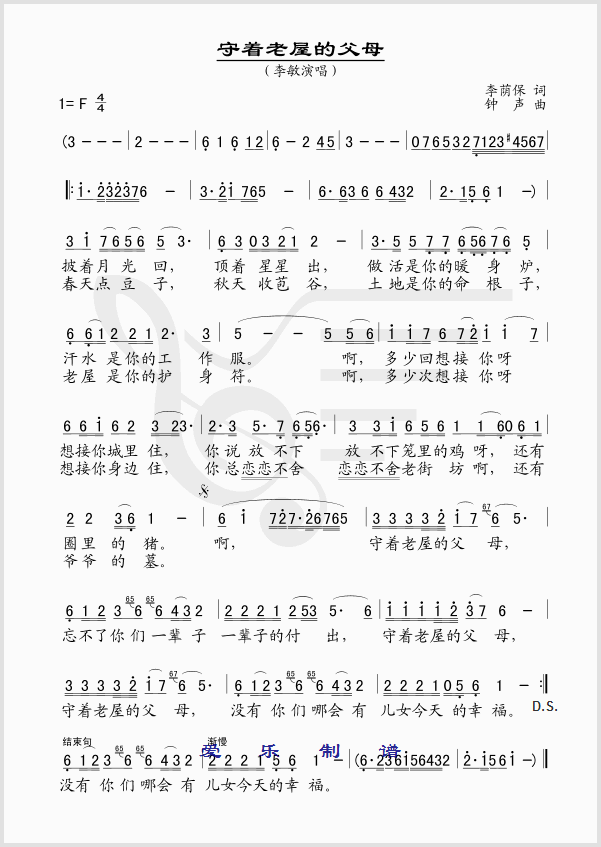 守着老屋的父母 简谱 曲谱 歌谱