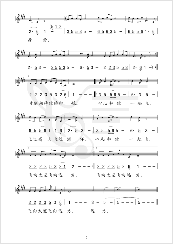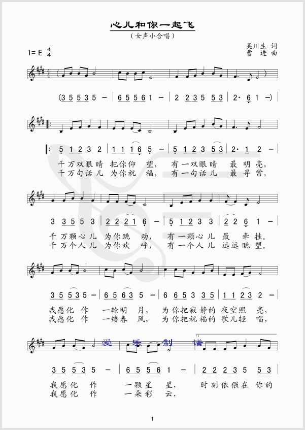 心儿和你一起飞 简谱 曲谱 歌谱