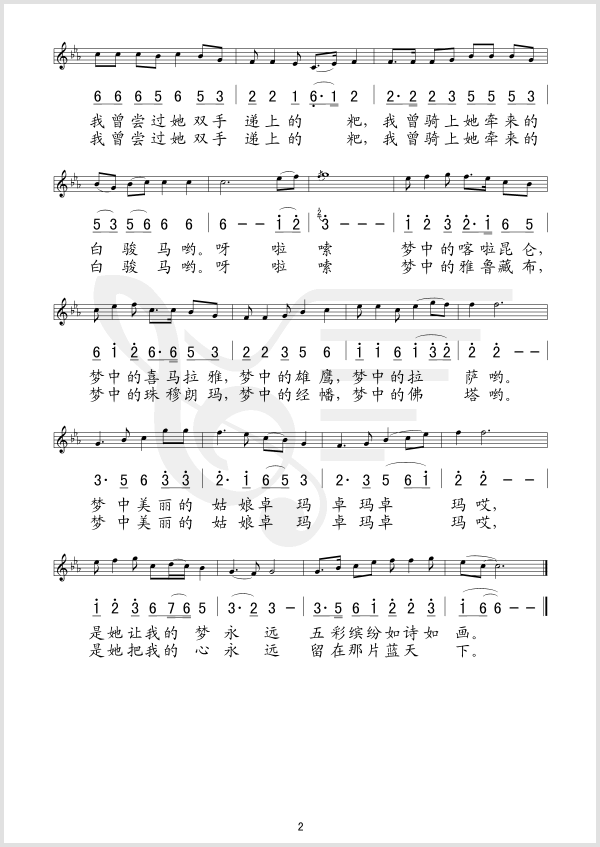 蓝天下的卓玛 简谱 曲谱 歌谱