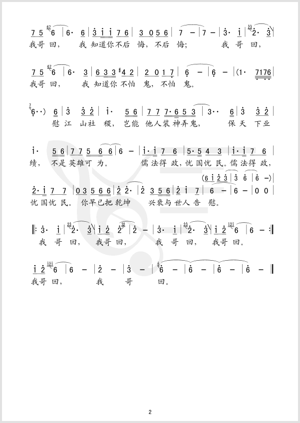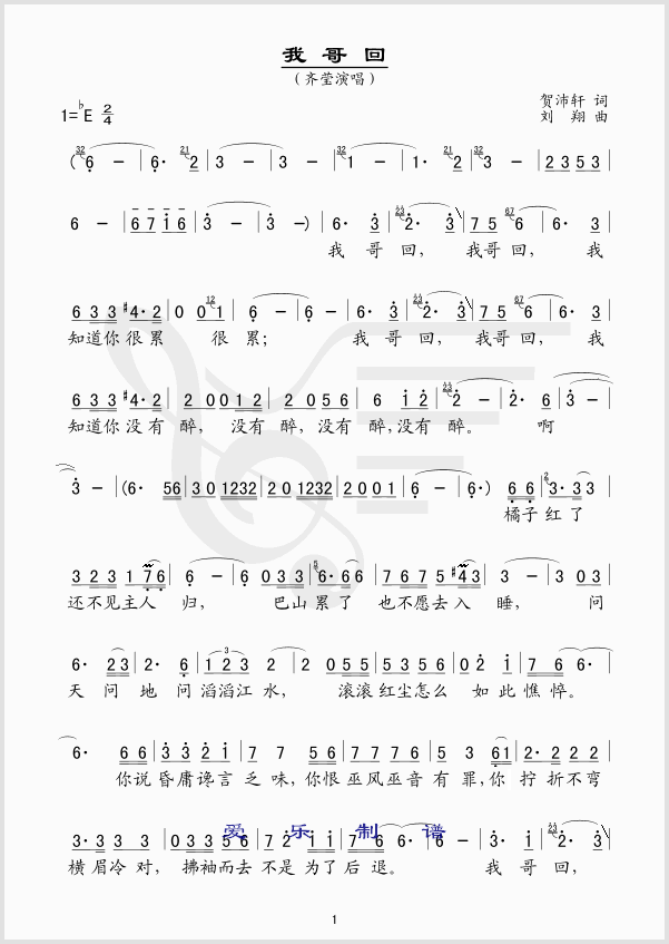 我哥回 简谱 曲谱 歌谱