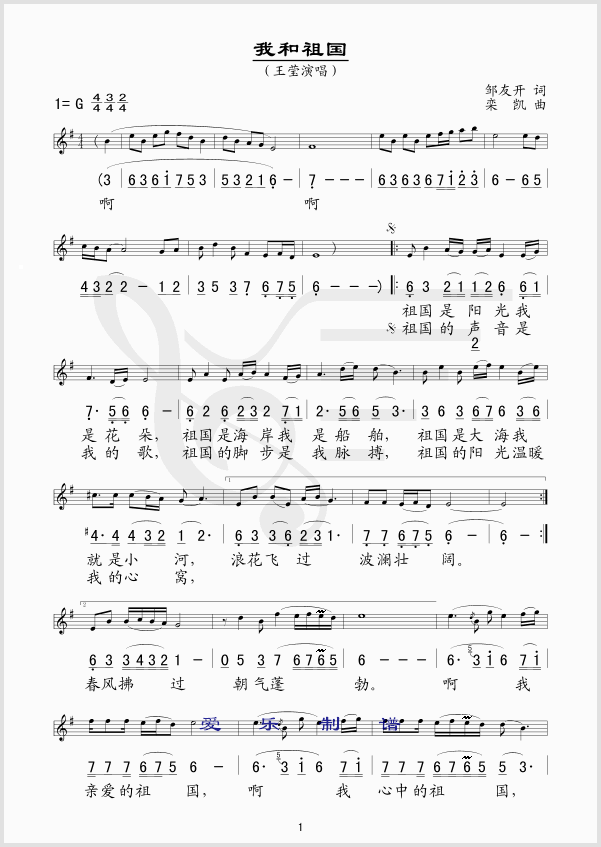 我和祖国 简谱 曲谱 歌谱