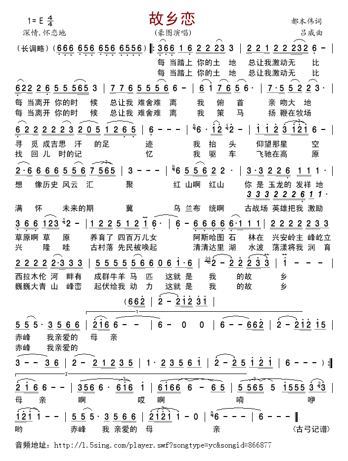 故乡恋 简谱 曲谱