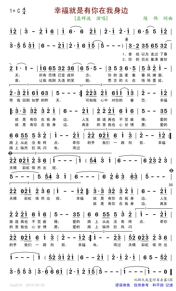 幸福就是有你在我身边 简谱 曲谱