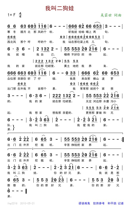 我叫二狗娃 简谱 曲谱