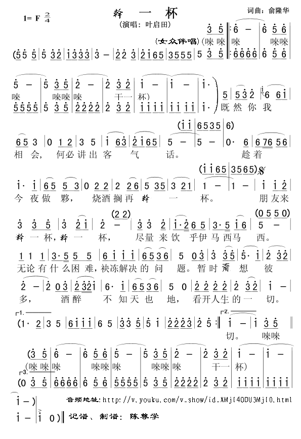 干一杯 简谱 曲谱