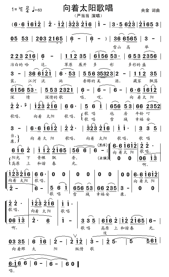 向着太阳歌唱 简谱 曲谱