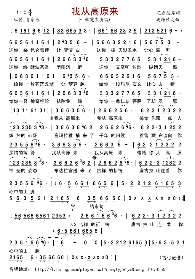 我从高原来 简谱 曲谱