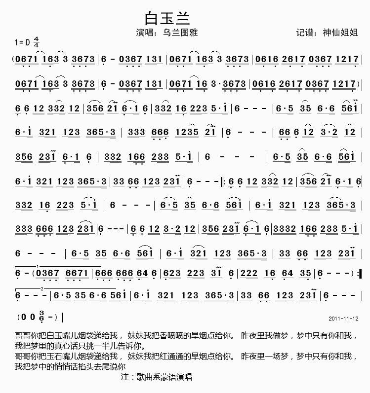 白玉兰 简谱 曲谱