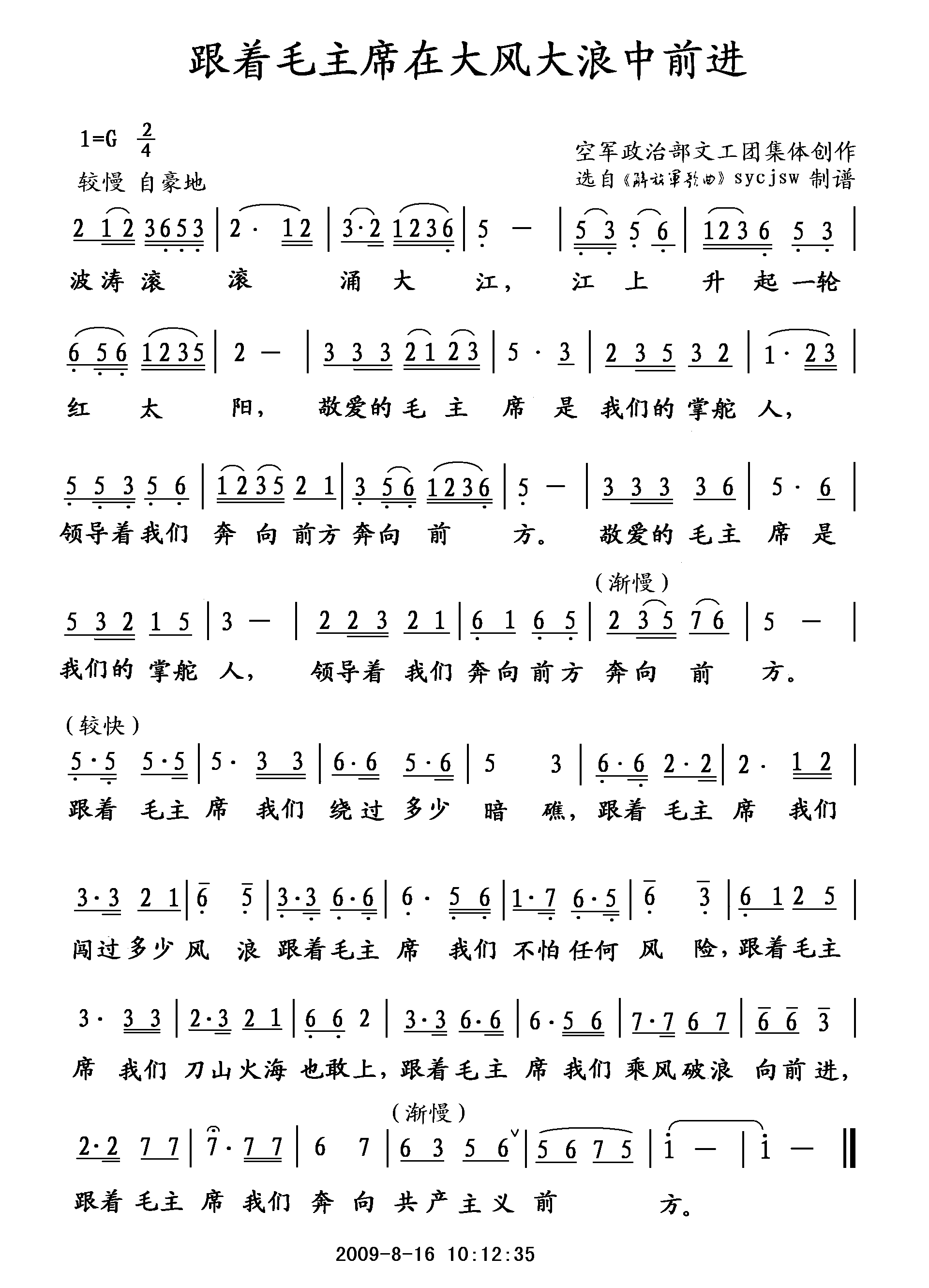 跟着毛主席在大风大浪中前进 简谱 曲谱