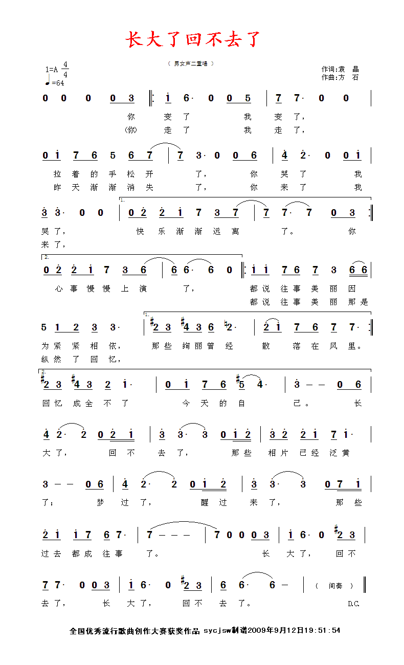 长大了回不去了 简谱 曲谱