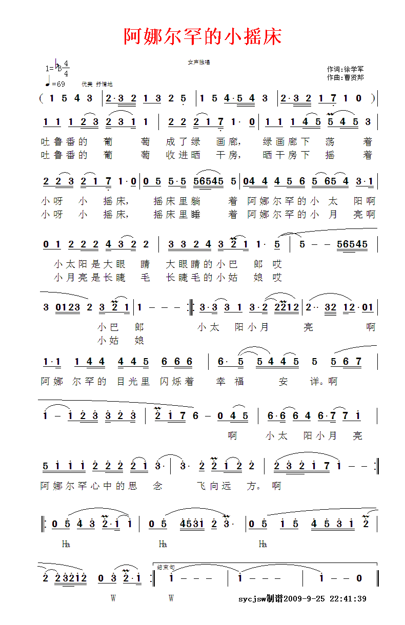 阿娜尔罕小摇床 简谱 曲谱